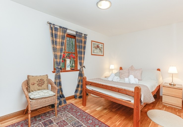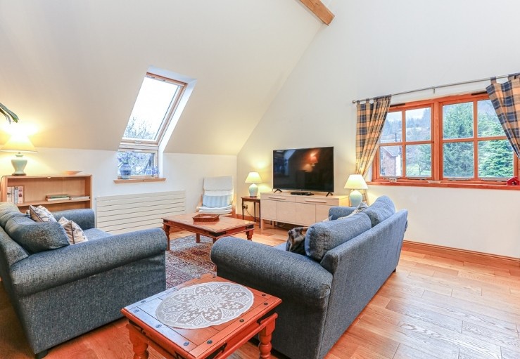 The spiral staircase then leads you upstairs to the galleried landing and cosy open-plan communal space. Two bedrooms lie on this floor, the master bedroom featuring an en suite bathroom and French doors opening to a Juliet balcony, showcasing the quiet woodlands of Strathyre Forest. The final bedroom also functions as a study and offers a comfortable king-size sofa bed and handy desk.
