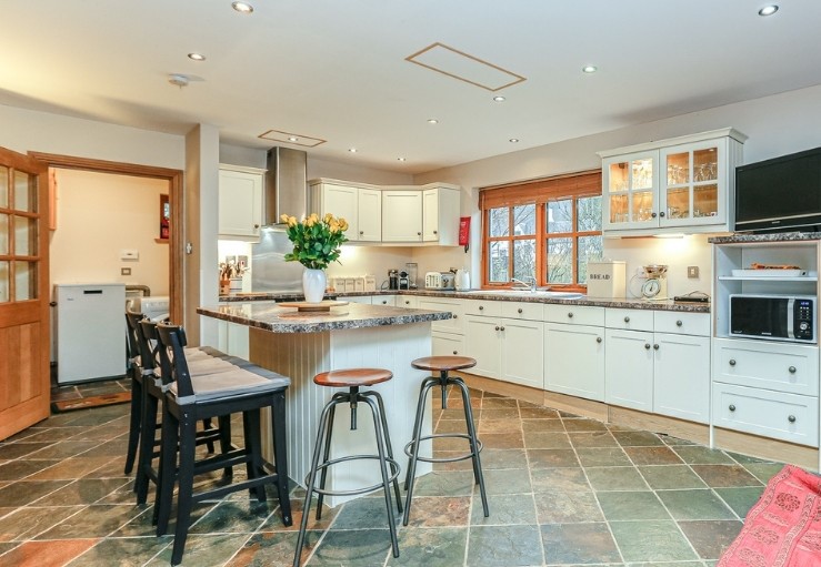 On entry, guests are greeted by cosy underfloor heating and a large open-plan living space, dining area and kitchen with ample places to rest and reset. The spacious kitchen is well-equipped for guests, highlighting an electric oven, Nespresso machine and a central kitchen island for catching up over a morning coffee.
