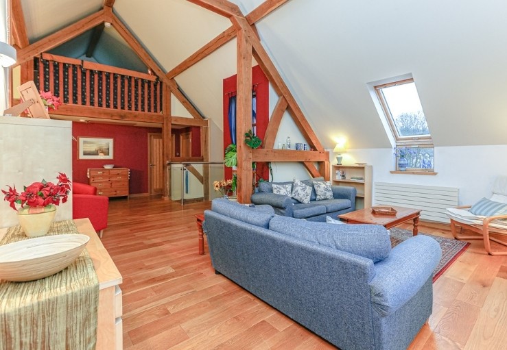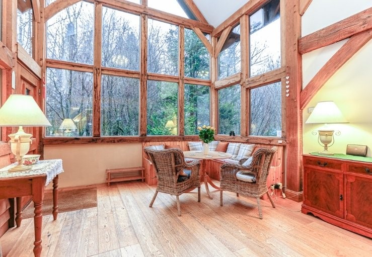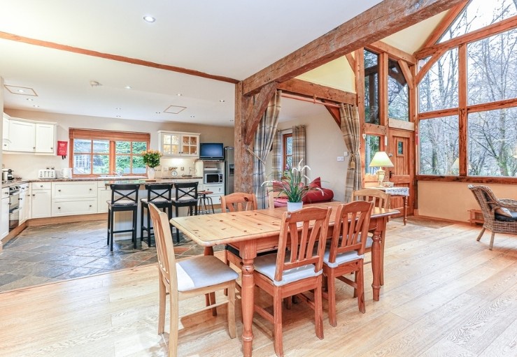 Built by its owners in 2006, this detached family home, settled behind the entrance road, features high vaulted ceilings, oak beams and a beautiful wooden interior. The home boasts open-plan living spaces and a glazed gable looking out to the surrounding woodland and a stream on the south side of the wraparound garden.