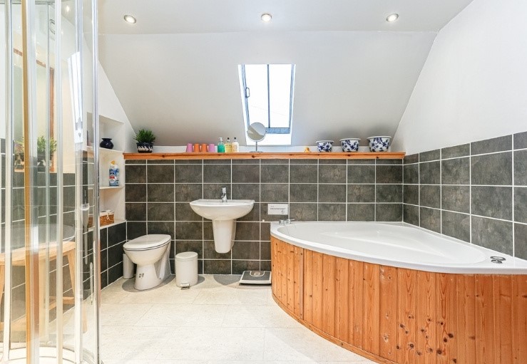 Double bedroom (king-size) with en suite bathroom with bath, separate shower, WC and wash basin