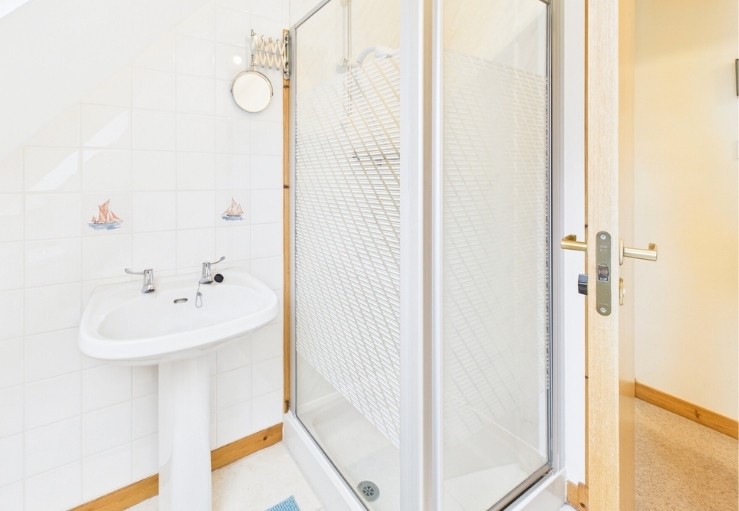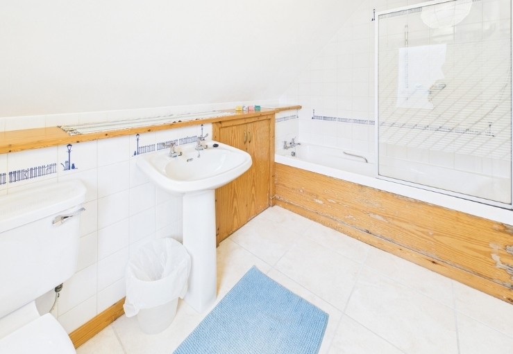 Upstairs, you’re met with a spacious landing leading to 5 bedrooms. On the left of the stairs, a double bedroom, straight on reveals a quasi-twin room with a single and small double bed, and to the right of there a king-size bedroom. The right side of the staircase leads to a twin room with a desk and a double bedroom. A family bathroom with a shower/ bath, and a smaller WC and shower serve residents upstairs, reducing the morning rush for the shower.