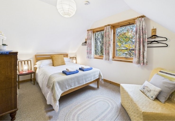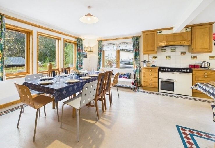 The combined dining room and kitchen has sufficient seating for 10, a large range style electric cooker and a small sofa, also with windows facing towards the woods. The utility space is ideal with convenient access from the back door to the downstairs WC. There is a washing machine, large ceiling clothes airer and plenty of hooks for outdoor clothing. An extra sink, extra gas LPG cooker and huge cupboard for extra food storage space are all provided for added convenience. Just to the right of the stairs leads you to another WC with a shower. Adjacent to here is a double bedroom, with a view looking towards the rear of the garden.