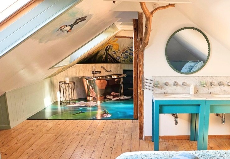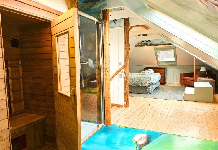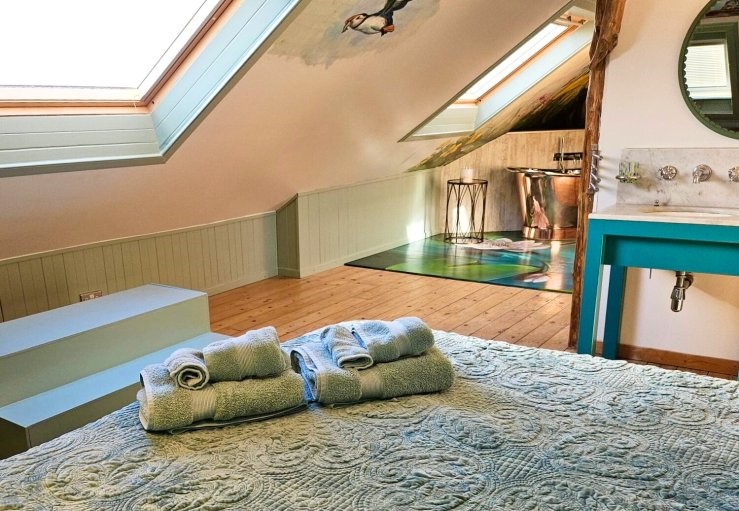 The master 'waterlily' suite occupies the entire first floor and boasts an extra-long Auping king-sized bed and an ensuite with a luxurious William Holland free-standing copper bath, infrared sauna, and expansive sea views. The ground floor 'machair' bedroom offers comfortable twin beds and a walk-in power shower with a rainfall shower head. All beds have hypoallergenic ‘down feel’ duvets and pillows for added comfort and assurance.